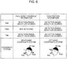 - Referring toFIG. 6, a detection range of a rotation angle of the face region included in the face detection result information is set, and a detection range of the posture of the face region included in the face position information is set. The face detection result information is represented in the right-hand coordinate system, and the face position information is represented in the left-hand coordinate system. In the face detection result information, theface detection processor 32 is set to have about ±20 degrees as a detection range of a rolling motion of the face. No detection is performed in a pitching motion of the face. Theface detection processor 32 is set to have about ±35 degrees as a detection range of a yawing motion of the face. In the face position information, thepart detail detector 35 is set to have about ±35 degrees as a detection range of a rolling motion of the face, about ±20 degrees as a detection range of a pitching motion of the face, and about ±40 degrees as a detection range of a yawing motion of the face.