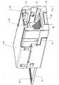 An das Vorderteil 30 schließt sich ein Isolationskörper 34 aus Kunststoff an. Der Isolationskörper 34 wird von hinten an das Vorderteil 30 angesetzt und verschließt mit seiner vorderen Stirnwand die Rückseite des Vorderteils 30. Eine über diese vordere Stirnwand vorspringende Bodenplatte des Isolationskörpers 34 bildet den Boden des Aufnahmeraumes des Vorderteiles 30. In der Stirnwand und der Bodenplatte des Isolationskörpers 34 sind Führungsschlitze 36 ausgebildet, die zur Aufnahme der Buchsenkontakte 38 dienen. Die Buchsenkontakte 38 sind in der für RJ-Buchsen bekannten Weise angeordnet und federnd ausgebildet. Die Buchsenkontakte 38 greifen durch die Führungsschlitze 36 in den Aufnahmeraum der Buchse und sind durch den Isolationskörper 34 isoliert.The