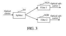 - Referring toFIG. 3, the opticalsub-carrier splitting device 210 includes asplitter 301 and two or more filters (302A, 302B) with different central frequencies.