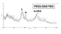 - PEGYLATION ANALYSIS BY MALDI-MASS SPEC. To confirm the PEGylation of the A2 domain in the heavy chain, the rFVlll sample, before and after PEGylation was analyzed by matrix-assisted laser desorption/ionization (MALDI) mass spectrometry. The samples were mixed and crystallized on the MALDI target plate with a sinapinic acid matrix in 30 % acetonitrile, 0.1% TFA. They were then analyzed in a Voyager DE-PRO spectrometer in positive, linear mode. The results, shown inFigure 10, showed the light chain of PEG2 centered at 83 kD and the heavy chain (HC) at 89 kD. The spectrum acquired for the PEGylated sample showed a drop in the HC peak and a new peak, centered at 111 kD, to form. This confirms PEGylation of the heavy chain. No PEGylated light chain (at 105 kD) was observed above detection limit.