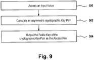 - computing a public key by using the private key, whereby for performing the calculation of the public key a cryptographic one-way function is used, the public key and the private key forming an asymmetric cryptographic key;