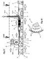 Die parallel zueinander verlaufenden Klettstreifen 51, 52 sind mit Abstand voneinander auf dem Trägerband 50 positioniert. Zwischen den benachbarten Klettstreifen 51, 52 ist eine Faltkante 54 gebildet. Diese kann durch eine Schwächungslinie, insbesondere durch eine Perforationslinie vorzugsweise mittig zwischen den Klettstreifen 51, 52 definiert sein. Gegenüberliegend zu den Klettstreifen 51, 52, also an der freien Seite des Trägerbands 50, ist ein Haftmittel angebracht, hier eine durchgehend Schicht eines Klebers 22. Des Weiteren ist vorliegend eine Abdeckung der freien Seite des Klebers 22 vorgesehen, nämlich ein Abdeckstreifen aus dünner Folie. Diese wird vor dem Abtrennen der Einheiten 23 entfernt. Bei dem dargestellten Ausführungsbeispiel sind einem Materialstreifen 49 zwei Abdeckstreifen 55, 56 zugeordnet. Diese sind voneinander geteilt bzw. teilbar. Bei dem Beispiel der