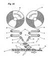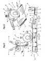 Die beiden zu vereinigenden Klettbänder 25, 26 sind (oberhalb der Übertragungsstation 24) als nebeneinanderliegende Streifenbobinen 28, 29 gespeichert. Von diesen werden die Bänder 25, 26 abgezogen und der Übertragungsstation 24 über erste ortsfeste Umlenkrollen 30 in horizontalen Schleifen zugeführt. Oberhalb und unterhalb sind bewegbare Tänzerrollen 31, 32 angeordnet, die (in horizontaler Ebene) eine Ausgleichsbewegung ausführen und eine konstante Spannung in den Klettbändern 25, 26 erhalten. Untere, ortsfeste (zweite) Umlenkrollen 33 führen die Klettbänder 25, 26 in konvergierender Abwärtsrichtung einem Vereinigungsorgan zu. Dieses weist Andrückrollen 34, 35 zu beiden Seiten der Klettbänder 25, 26 auf. Die Rollen werden entsprechend der Bewegungsrichtung der Klettbänder 25, 26 angetrieben (Pfeile). Der Abstand der Mantelflächen ist so gewählt, dass die Klettbänder 25, 26 im Bereich der Klettbeschichtungen 20 zusammengeführt und miteinander verbunden werden.The two