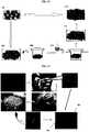 - Figure 1D is a schematic illustration and optical microscopy images of a process in whichliving cells103 fill upcavities105 within a degradable hydrogel matrix. Row (a) shows a schematic illustration of living cell movement as they are being incubated in the degradable hydrogel. The column panels from (i) to (v) show the various stages. In stage (i),living cells103 are dispersed in thedegradable hydrogel101. At this stage, theliving cells103 can proliferate in the hydrogel. In addition, theliving cells103 can migrate or move in the direction as shown by the arrows towards thecavities105. In stage (ii), theliving cells103 can sprout out of a hydrogel-cavity interface. In stage (iii), theliving cells103 can continue to grow and form neo-tissues, which can line the inner surface of thecavities105. As shown in stage (iv), thecavities105 can eventually be filled up with neo-tissues formed by theliving cells103, thereby forming islets, which can be spherical. In stage (v), the islets can fuse together, forming a network of interconnecting tissues, which can lead to formation of a scaffold for tissue engineering. The row panels from (b) to (d) show optical microscopy images of histological indication using (b) hematoxylin and eosin (H&E) stain in stage (i) to (iii) and (v), and Masson's Trichrome stain in stage (iv) which shows collagen production in blue (circled using dash line); (c) Safranin-O stain in stage (i) to (v) to show glycosaminoglycan (GAG) production in red (indicated using arrows), and (d) multiple fluorescence microscopy (MFM) using fluorescent DAPI (4',6-diamidino-2-phenylindole) stain to position the cell nuclei in purple, and green fluorescent calcein to stain the living cells in stage (i) and (iii), and immunohistochemical stain conjugating with green fluorescent chromophore to stage (ii), (iv) and (v) with type II collagen as the primary antibody. The staining results illustrated inFigure 1D show the high viability of the cells throughout the neo-tissue islet generation and the increasing total collage production from the cells in the microcavity cell (MCG) construct. With further cultivation, these scaffold-free islets act as neo-tissue cores and demonstrated strong tendency of expansion to fuse with each other and also with the isolated cells or colonies remaining in gel bulk so that a piece of maximally scaffold-free 3D macroscopic tissue was tangibly engineered. Driven by the outward mechano-orientation due to the biomechanical response between hydrogel scaffold and the cell colonies inside, cells proliferate fast, and then sprout into the formed cavities and outgrow, finally fuse to form a scaffold for tissue engineering.