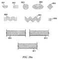 - Another important aspect of this novel material for use in or with a compression device is the variation in thickness of the material. The material may in some embodiments have variations of thicknesses with a geometrical or wave-like pattern. These variations of thickness would effectively augment a push-pull mechanism on the underlying skin. The space between these waves and depth of these waves would vary. These waves would be 4mm to 5cm linear distance from apex to apex of the wave with a wave height of 1 mm to 1 cm, although larger heights and shorter or longer linear distances between apexes are possible. These waves in the material height may be perpendicular to the length of the finger-like projections, or may be asymmetrical. The waves/geometric patterns may all be symmetrical in length and height or may be asymmetrical. Certain material thickness and patterns may be advantageous over certain body areas, and any combinations may be used to get the desired effect.Figures 28a and28b show geometrical shapes 2801 - 2805 as well as waves 2806. Thesewaves 2806 are shown only on one side of the material, but it is understood the geometrical patterns may be on one or both sides of the material for added effect, enhanced breathability, reduced material costs, and reduced cost of manufacture. Additionally, the waves or geometrical shapes may be on the side of the padding that goes against the skin, or for more subtle effect may go on the side away from the skin, so that the overlying compression provides the effect. The side going toward the skin may or may not have an adhesive layer to attach to the skin.