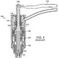 - Theportion 1260 also includes asurface 1288 that includes afirst region 1290 for electrical communication with theresilient element 1212 and asecond region 1292 for electrical communication with thepower contact 1216, e.g., via physical contact with acorresponding surface 1294 of thepower contact 1216. Theresilient element 1212 resiliently urges theelectrode 1204 toward thedistal end 1224. Theelectrode 1204 is hindered from being ejected from the torch by a nozzle (not shown) that is in physical contact with thedistal end 1224 when the nozzle is installed. The nozzle is secured to the torch so that the portion 1260 (e.g., via the first region 1290) is in physical contact with theresilient element 1212. For example, installing the nozzle urges theportion 1260 through theslot 1284 and positions thefirst region 1290 in physical contact with theresilient element 1212. When the nozzle is installed, the resilient element is compressed.