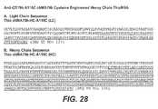 - Figure 28 shows (A) the light chain sequence (SEQ ID NO: 237) and (B) heavy chain sequence (SEQ ID NO: 236) of cysteine engineered anti-CD79b antibody (thio-MA79b-HC-A118C), in which an alanine at EU position 118 (sequential position alanine 118; Kabat position 114) of the heavy chain was altered to a cysteine. A drug moiety may be attached to the engineered cysteine group in the heavy chain. In each figure, the altered amino acid is shown in bold text with double underlining. Single underlining indicates constant regions. Variable regions are regions not underlined. Fc region is marked by italic. "Thio" refers to cysteine-engineered antibody.