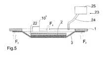 Auf der gegenüberliegenden Seite des Films 3 zum Produktsubstrat 4 ist ein Schallwellenerzeuger 10, insbesondere zur Erzeugung von Ultraschallwellen, anordenbar, durch welchen Ultraschallwellen auf das Produktsubstrat 4, insbesondere jedoch auf die Verbindungsschicht 6 und das Lösungsmittel 22 übertragen werden können, da hierdurch der Vorgang des Lösens stark beschleunigt wird, insbesondere um eine Faktor 2, vorzugsweise um eine Faktor 5, noch bevorzugter um einen Faktor 10 bis 50.On the opposite side of the
