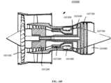 FIG. 105 is a perspective view of an exemplary embodiment of a turbo-machine 105000, such as a ducted fan gas turbine engine, which can comprise, in axial flow series, afan 105100,intermediate pressure compressor 105200,high pressure compressor 105300,combustion equipment 105400, high, intermediate andlow pressure turbines 105500, 105600 and 105700 respectively and anexhaust nozzle 105800. Air can be accelerated byfan 105100 to produce two flows of air, the larger of which can be exhausted from theengine 105000 to provide propulsive thrust. The smaller flow of air can be directed into theintermediate pressure compressor 105200 where it can be compressed and then into thehigh pressure compressor 105300 where further compression can take place. The compressed air then can be mixed with fuel in thecombustion equipment 105400 and the mixture combusted. The resultant combustion products then can expand through the high, intermediate, andlow pressure turbines 105500, 105600, and 105700 respectively before being exhausted to atmosphere through theexhaust nozzle 105800 to provide additional propulsive thrust.