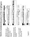 - Figure 18, panels A and B, depict the sequencing results observed following endogenous cleavage of the NTF3 locus in K562 cells using TALENs.Figure 18A depicts the chromosomal sequence (SEQ ID NO:139-140) and the boxes delineate the binding sites for the two TALENs.Figure 18B depicts a compilation of sequencing results of the NTF3 locus from cells treated with the different NTF3 TALEN pairs described in Example 8 aligned with the wild-type ("wt") sequence (SEQ ID NO:141-175).