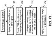 - FIG. 13 shows a flowchart of the artifact detection process utilized within the present invention for the purposes of discovering artifacts from muscle movements. AnEEG signal 130 is captured and a band-pass filter 131 is applied to the signal. This filtered signal is then broken up into individual,non-overlapping sub-segments 132. The subsampled EEG epoch is then used to compute the muscle artifact measure,G 133, which is aimed at detecting high-frequency EEG activity which tends to indicate muscle movement artifacts within the EEG signal. The weight that was determined for this measure during the optimization process is then assigned to the value of theG measure 134.
