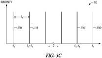 - For spectroscopy applications, this allows the frequency to be stepped in increments smaller than the comb peak frequency spacing, " ƒs- ," such as to provide full frequency coverage at a desired frequency sampling resolution. For example, a first array of frequencies including the first and second peaks-  912A-B of the first frequency-domain comb can be used for a first spectroscopic measurement, in a multiplexed manner. A second array of frequencies including the first and second peaks-  914A-B of the second frequency-domain comb (e.g., including linearly increasing phase shift for successive chirp pulses included in the pulse train establishing the second frequency-domain comb) can be used for a second spectroscopic measurement, such as corresponding to frequencies located between the frequency-domain comb peaks of the first frequency-domain comb.