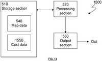 - A navigation device of the present embodiment is shown inFig. 13. The elements ofFig. 13 are similar to the correspondingly numbered elements in the embodiment ofFig. 5. InFig. 13, time-dependent cost data 1550 is provided in thestorage section 510. The cost data may be provided in addition to, or instead ofavoidance data 550. As with theavoidance data 510, the time-dependent cost data 1550 maybe combined with themap data 540.