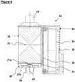 - The lower part of theradiator component 20 comprises a generally planer base, with an upstanding, peripheral skirt having an outwardly projecting flange at its upper end that is fixed to the flange at the lower end of the intermediate part of theradiator component 20. The lower part of theradiator component 20 therefore defines achamber 40 disposed at the lower end of the flow passageways 28 of theradiator component 20, which acts as a sump for collecting water that condenses from the respiratory gases flowing through theradiator component 20, and flows down the flow passageways 28 under the influence of gravity.