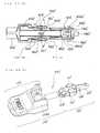 - In the state shown inFig. 34(f) andFig. 35(f), even when the trigger part 400' is intended to move forwardly with respect to the holder 200', the re-use preventing wings 424' of the trigger part abut against the protrusions 218' of the holder, so that the trigger part cannot be forwardly moved any more. Moreover, even when the trigger part 400' is intended to move backwardly with respect to the holder 200' in the state shown inFigs. 34(f) and35(f), the stepped portions of the trigger part abut against the wall of the holder, so that the trigger part 400' cannot be backwardly moved any more.