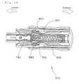 - As shown inFigs. 26(b) and26(c), the inner walls of the lateral sides of the holder 200' are respectively provided with sloped portions 250'. The sloped portion 250' has a slopedsurface 250a' which is inclined toward the center of the holder (i.e., toward the inward) in the forward direction. In the example shown inFigs. 26(b) and26(c), the sloped portions are provided at upper lateral side and lower lateral side of the holder (note that only the sloped surface provided at the lower lateral side is shown). As mentioned later, a part of the each arm of the trigger part slides on the sloped surface 250a'or move while contacting thesurface 250a'. Specifically, when the trigger part 400' is forced to move backwardly with respect to the holder 200', the free end of the each arm 420' slides on the slopedsurface 250a or moves on the slopedsurface 250a under friction against thesurface 250a in the direction from the front toward the rear. As a result, the outward expansion of the arms is automatically performed.