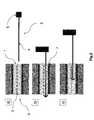 - Fig.6 schematically represents a third exemplary production process of apolymeric foam layer1 for use in the method according to one aspect of the present invention and of one aspect of anadhesive assembly6 according to the invention. The depicted process is based on the so-called in-line wet-on wet coating technique which involves in-line application of two or more wet layers to a substrate with subsequent curing by a photochemical method using UV light. Such a technique is fully described in the international patent applicationWO 2011094385-A1. In step a) of the depicted method, twowet layers11, which are liquid precursors of thepolymeric foam layer1, as well as a plurality offibers2 are loaded into an appropriate coating station, in such as way that the plurality offibers 2 are embedded in-between the twowet layers11. The assembly constituted by the twowet layers11 and the plurality of embeddedfibers2, is coated onto aliner8. In step b) of the depicted method, the assembly is foamed in an appropriate manner using e.g. the method described in patentUS 4,415,615. In step c) of the depicted method, the foamed assembly resulting from step b) is appropriately cured using a curingstation12, thereby forming apolymeric foam layer1b comprising a plurality of embeddedfibers2 and coated onto aliner8. In step d) of the depicted method, theliner8 is removed and stretch releasingadhesive tapes7 are laminated on both sides of thepolymeric foam layer1, thereby forming anadhesive assembly6 according to the invention.