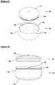 - The container may have any suitable construction, but is preferably formed of a number of cooperating components. Most preferably, the container is formed from two cooperating components fastened together by any suitable means, such as by snap fit, screw fit, bayonet or ultrasonic welding. The container may also be formed as a single component with the two cooperating components being connected by a hinge. The container preferably comprises a cup component and a lid component, where the lid component is engageable with the cup component, and the cup component and a lid component define the internal volume of the container. In a preferred embodiment, the cup component is of generally cylindrical construction, open at one end, and a lid component fastens over the open end of the cup, thereby completing the cylindrical container. The preferred fastening means in this embodiment is a snap fit, either circumferentially or by means of a central pin.
