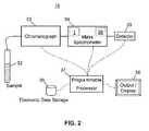- Still referring toFIG. 2, aprogrammable processor37 is electronically coupled to the detector of the mass spectrometer and receives the data produced by the detector during chromatographic / mass spectrometric analysis of the sample(s). The programmable processor may comprise a separate stand-alone computer or may simply comprise a circuit board or any other programmable logic device operated by either firmware or software. Optionally, the programmable processor may also be electronically coupled to the chromatograph and/or the mass spectrometer in order to transmit electronic control signals to one or the other of these instruments so as to control their operation. The nature of such control signals may possibly be determined in response to the data transmitted from the detector to the programmable processor or to the analysis of that data. The programmable processor may also be electronically coupled to a display orother output38, for direct output of data or data analysis results to a user, or toelectronic data storage36. The programmable processor shown inFIG. 2 is generally operable to: receive a precursor ion chromatography / mass spectrometry spectrum and a product ion chromatography / mass spectrometry spectrum from the chromatography / mass spectrometry apparatus and to automatically perform the various data analysis, data retrieval and data storage operations in accordance with the various methods discussed below.