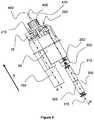 - Areversible drive unit 300 with an electric actuator, andcircuitry 350 are further provided.Circuitry 350 in particular includes control circuitry for controllingdrive 300.Drive unit 300 andpiston 225 are coupled via a releasable drive coupler, the drive coupler including adisposable drive coupler 250, 320 as will be discussed below. Drive 300 may include a motor, such as a standard DC motor, a brushless or electronically commutated DC motor (EC motor) or a stepper motor and an optional reduction gear (not shown). Feedback to controlcircuitry 350 may be provided by an encoder ofdrive unit 300 and/or a further encoder including an encoder scale on piston 325, as will be discussed below.