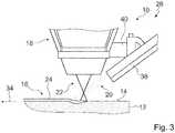Zu einem Einbringen des neuen Materials 20 in den Teilbereich 16 wird zunächst mittels des Lasers 18 ein Laserstrahl 22 erzeugt, der in dem Teilbereich 16 auf die Platteneinheit 12 gerichtet wird. In dieser Situation wird die Platteneinheit 12 in einer Bewegungsrichtung 34 unter dem konstanten Laserstrahl 22 bewegt. Das neue Material 20 wird in den von dem Laser 18 erzeugten Laserstrahl 22 hineingesprüht. Hierbei wird das neue Material 20 mittels dem Laser 18 aufgeschmolzen. Das neue Material 20 wird aus der Düse 38 heraus mittels der kinetischen Energie, die dem neuen Material 20 in der Düse 38 zugeführt wurde, in den Laserstrahl 22 hineingesprüht. Hierbei wird das neue Material 20 unter einem Winkel von im Wesentlichen 55° relativ zu dem Laserstrahl 22 in den Laserstrahl 22 hineingesprüht. Das neue Material 20 trifft, bevor es in dem Teilbereich 16 angekommen ist, auf den Laserstrahl 22, mittels dem das neue Material 20 aufgeschmolzen wird. Somit gelangt das neue Material 20 in aufgeschmolzenem Zustand in den Teilbereich 16. Aufgrund der hohen kinetischen Energie passiert das neue Material 20 den Laserstrahl 22. Anschließend trifft das neue Material 20 in aufgeschmolzenem Zustand die Oberfläche 14 der Platteneinheit 12, wobei das neue Material 20 bezüglich der Bewegungsrichtung 34 auf einen Abschnitt der Oberfläche 14 der Platteneinheit 12 auftrifft, den der Laserstrahl 22 bereits passiert und erhitzt hat. In dem Teilbereich 16 lagert sich das neue Material 20 auf der Oberfläche 14 der Platteneinheit 12 ab, welche sich durch den Laserstrahl 22 in erhitztem Zustand befindet. Hierbei ist die Platteneinheit 12 auf eine Temperatur kleiner als eine Schmelztemperatur der Platteneinheit 12 erhitzt. Alternativ ist denkbar, dass die Platteneinheit mittels Laser aufgeschmolzen wird, insbesondere auf eine Temperatur gleich oder größer als die Schmelztemperatur der Platteneinheit erhitzt wird.For introducing the