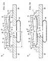 - Referring now toFigures 10A and10B, an exploded view of the two-valve disc pump 10 is shown that utilizesvalve 110 asvalves 29 and 32. In this embodiment theactuator valve 32 gates airflow 232 between theactuator aperture 31 andcavity 16 of the disc pump 10 (Figure 10A), whileend valve 29 gates airflow between thecavity 16 and theoutlet aperture 27 of the disc pump 10 (Figure 10B). Each of the figures also shows the pressure generated in thecavity 16 as theactuator 40 oscillates. Both of thevalves 29 and 32 are located near the center of thecavity 16 where the amplitudes of the positive and negativecentral pressure anti-nodes 45 and 47, respectively, are relatively constant as indicated by the positive and negative square-shapedportions 55 and 65, respectively, as described above. In this embodiment, thevalves 29 and 32 are both biased in the closed position as shown by theflap 117 and operate as described above when theflap 117 is motivated to the open position as indicated by flap 117'. The figures also show an exploded view of the positive and negative square-shapedportions 55, 65 of thecentral pressure anti-nodes 45, 47 and their simultaneous impact on the operation of bothvalves 29, 32 and thecorresponding airflow 229 and 232, respectively, generated through each one.