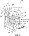 - Reference is now made toFIG. 3 showing a simplified schematic drawing of an exemplary drying station in accordance with some embodiments of the present invention. According to some embodiments of the present invention, dryingstation 116 provides heat transfer to dry layers of the printed object by impinging jets of hot air onto the layers. According to some embodiments of the present invention, ablower 154 includes ablower inlet 156 for sucking hot air from ahousing 165 of dryingstation 116 and ablower outlet 158 for blowing air intohousing 165. Optionally,blower 154 is capable of air transfer at a temperature of around 220°C as may typically be required for humectant evaporation. In some exemplary embodiments, hot air is substantially continuously circulated to reduce power consumption of dryingstation 116 and also to contain the solvent vapor that is formed within the drying station so that the vapor is not spread into the surrounding environment of the printing system, e.g. the room in which the printing system is stationed.