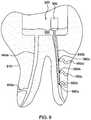 - Returning toFIG 7, to position thetip 700, the maincoronal chamber 720 of thetooth 710 has been opened surgically. With the main canals and lateral canals. In this figure, both themain canals 740a-740b andlateral canals 750a-750b are visible.