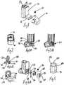 - Thedose counter 36 will now be described. Thedose counter 36 includes anactuation pin 34 biased upwardly from underneath by areturn spring 56 once installed in themain body 10. As best shown inFigures 4A,6H and8A, thepin 34 has side surfaces 58, 60 arranged to slide between corresponding guide surfaces 62, 64 located in adose counter chamber 66 of themain body 10, as well as anend stop surface 68 arranged to engage a corresponding end stop 70 formed in thedose counter chamber 66 to limit upward movement of thepin 34. Thepin 34 has atop part 72 which is circularly cylindrical and extends through anaperture 74 formed through aseparator wall 76 which separates thecanister chamber 18 from the dose