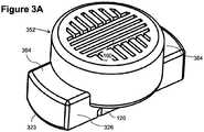 •An alternative cover geometry- Fig. 3A illustrates an alternative cover geometry according to an exemplary embodiment of the current invention. Cover352 may optionally fit the same body and/or conduit asembodiment100. Cover352 may differ fromcover152 for example in thatcover352 haslarger wings364 and alarger orientation element326 thancover152. Cover352 may optionally have a large area ofcurved bonding surface323 for bonding to the inner wall of the conduit. Alternatively or additionally a cover with larger wings (for example like wings364) may also be a part of a two part labyrinth (for example the flow restrictor may be similar to flow restrictor228).