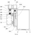 - In the example of embodiment according toFig. 8a,b, the measuringhead3 is mounted on amovable member2231, which is adjustably mounted on a verticallinear guide system223, and coupled to a drive, which is in the illustrated embodiment composed of a steppingmotor224 for providing a vertical movement of the measuringhead3, that is its movement towards thetextile5 being measured and away from it. In order to control the steppingmotor224 for providing the vertical movement of the measuringhead3, a known control circuit is used (not shown), in which is included an unillustrated sensor of the distance of the measuringorifice300 of the measuring head from thetextile5 which is usually arranged on the measuringhead3.