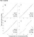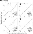 - FIG. 7 shows a series of panels illustrating LACHESIS ordering of scaffolds in ade novo human assembly according to some embodiments.FIGS. 7a-7v show the results of LACHESIS ordering and orienting on 22 of the 23 chromosome groups in thede novo human assembly. For each ordering, only the scaffolds on the "dominant chromosome" (the chromosome containing the plurality of aligned sequence) are shown. The exceptions are two groups that correspond to fusions of small chromosomes (19 and 22 (FIG. 7s);20 and21 (FIG. 7t)) (seeFIG. 44). Within each of these fused groups, the two chromosomes were well separated by ordering (FIG. 7s, FIG. 7t). The arms of the X chromosome clustered to two groups (FIG. 7u, FIG. 7v). Not shown is one very small chimeric group (length = 6.5 Mb; seeFIG. 8w). Also listed in each panel are the identity of the dominant chromosome, the number of scaffolds in the derived ordering, and the reference length of the dominant chromosome.