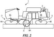 - As an alternative to the system just described using two DGPS receivers, it is also to devise a control system using a single DGPS receiver. Such a control system would lock the rear drive tracks 4B in a straight forward position. The machine could then automatically follow a curve based on the data of just one DGPS sensor because there is a fixed center of rotation at the locked tracks. In this case the orientation of the machine could be determined by observing the position data of the one DGPS sensor, the alignment of the steerablefront tracks 4A and the distance driven.