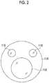 - An exit end of the light guide (not illustrated) is disposed behind theillumination windows 118 and 118 ofFig. 2. The light guide is inserted through theendoscope insertion part 102 and thecable part 104 ofFig. 1 and has an incident end disposed within the connector (not illustrated). Therefore, by coupling the connector to thelight source device 110, the illumination light radiated from thelight source device 110 is transmitted to theillumination windows 118 and 118 via the light guide, and is radiated forward from theillumination windows 118 and 118. In addition, inFig. 2, the twoillumination windows 118 and 118 are disposed on thedistal end surface 114 of theendoscope insertion part 102. However, the number ofillumination windows 118 is not limited, and the number thereof may be one or may be three or more.