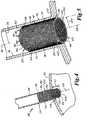 - Functionally, thelateral protrusions 122 interfere with thearterial wall 74 orostium 24 when implanted. In the embodiment ofFIG. 5, the interference of the protrusions with theostium 24 effectively registers thefilter cap 44 in the geometrical plane of theostium 24. In other embodiments,protrusions 122 are located distal to the filter cap 44 (i.e., extend laterally from the body 46) to interfere with thearterial wall 74 when thebarbed filter device 120 is pressed into theartery 26. Thus, thebarbed filter device 120 is secured by a mechanism other than (or in addition to) interference between thebody 46 and thearterial wall 74, and can be positioned precisely in theostium 24 before being implanted using techniques described earlier to provide expansion of theporous wall 48 of thebody 46.