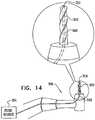 - Reference is made toFig. 14, which is a schematic illustration of adental drill 300, in accordance with an embodiment of the present invention.Drill 300 comprises abit 310 which is shaped so as to define alumen 340 therethrough that is open to a distal portion of the bit that extends from adistal end 314 of the bit along up to 8 mm of a longitudinal length of the bit, such as up to 6 mm of the length, up to 4 mm of the length, or up to 2 mm of the length. For some applications,lumen 340 is open todistal end 314 of the bit, either at the tip of the bit or in the general area of the distal end of the bit. The surgeon usesdrill 300 to perform a sinus lift procedure (e.g., a controlled sinus lift procedure, such as described hereinabove with reference toFigs. 11A-D), a lateral ridge augmentation (such as described hereinbelow with reference toFigs. 22A-F orFigs. 23A- F), or another dental procedure.Drill 300 is coupled to a source ofpressure 354. While the surgeon drills a bore through the maxillary alveolar ridge,fluid source 354 provides a fluid under monitored pressure to the distal bit portion, such as distal bit end 314, vialumen 340. The fluid typically comprises a biocompatible solution such as normal saline solution, or a gas, e.g., air.
