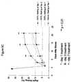 - Figure 5C shows body swing behavioral scores following permanent ligation of the middle cerebral artery. Rats were treated with GGF2 starting 1, 3 or 7 days after the ligation. GGF2 was delivered at 0.1 mg/kg, IV daily for 10 days. Body swing scores were significantly better than vehicle when treatment was initiated 1 day after ligation , and were improved compared to vehicle with treatment initiated 3 or 7 days post ligation. (*, ¥, + indicate significantly different from vehicle for theday 1, 3 and 7 treatment groups, respectively by repeated measures ANOVA and post-hoc Tukey).