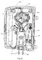 - Referring now toFIGS. 20A-20D, thebottom plate 1001 includes various organizer features integrated thereon. Thebottom plate 1001 includes an airtrap retaining member 1032 having tube guides 1033 and 1034 defined on thebottom plate 1001. The tube guides 1033 and 1034 guide a tube to and from an air trap disposed within the airtrap retaining member 1032. Thebottom plate 1001 also includes additional tube guides 1035 and 1039. Thebottom plate 1001 also defines a receivingportion 1036 to receive an electrical connector that may be used in an arrangement to monitor for disconnection of the arterial or venous lines from a patient during therapy.FIG. 21 shows a perspective view of thefront panel 511 of thedialysis unit 51 with theblood circuit assembly 17 mounted to thefront panel 511 without the organizingtray 171. (Normally, theblood circuit assembly 17 would include the organizingtray 171, but thetray 171 is not shown in the example so as to more clearly show components at thefront panel 511.) On opposite sides of theblood pump 13 cassette, thefront panel 511 hasspring tabs 516 that extend forwardly and resiliently engage with the blood pump cassette and/or the organizingtray 171 to retain theblood circuit assembly 17 in place. Thetabs 516 may include a barb or other feature to help retain theblood circuit assembly 17 in place. Thespring tabs 516 may be flexed outwardly to release their hold on theblood circuit assembly 17, allowing its removal. However, in the absence of an outwardly directed force on thespring tabs 516, thetabs 516 will remain engaged with theblood circuit assembly 17.FIG. 22 shows a front view of thefront panel 511 with the organizingtray 171 of theblood circuit assembly 17 included. To remove theblood circuit assembly 17 from thefront panel 511, a user may place index fingers behind thehandles 172 while simultaneously placing thumbs on the inner side of the spring tabs 516 (the sides nearest the blood pumps 23) and flexing thespring tabs 516 outwardly and away from thepumps 23. This causes thespring tabs 516 to release theblood circuit assembly 17, e.g., disengagement of barbs on thetabs 516 from theblood pump 13 and/or the organizingtray 171. Of course, to remove theblood circuit assembly 17, other connections must be removed, including connections to thedialyzer 14 and the blood line connection points 514, as well as removal of thelines 203, 204 from theoccluder 513. When mounting theblood circuit assembly 17 to thefront panel 511, the organizingtray 171 may be grasped at thehandles 172 and properly aligned, e.g., so that thespring tabs 516 are aligned to pass through theopenings 173 and the control ports of theblood pump 13 cassette are aligned with the correspondingports 515 on thefront panel 511. Theblood circuit assembly 17 may then be simply pushed into place, so that thespring tabs 516 engage with the organizingtray 171 and/or the blood pump cassette. Other connections can then be made, such as connections to thedialyzer 14, mounting of the blood lines 203,204 with theoccluder 513, etc.