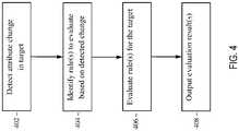 FIG. 4 is a block diagram depicting an example process for continuous monitoring of drift and consistency in a system comprising a plurality of targets. Atblock 402, a change in a configuration attribute is detected. The change may be to one oftargets 112a to 112n or to a golden source information file.Rule management logic 124 may monitor data collected bycollection logic 122 and the golden source information associated with the set of rules in order to detect the change.