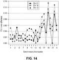 - Figure 13 shows the distribution of the chromosome doses for chromosome Y determined from sequencing cfDNA extracted from a set of 48 test blood samples obtained from human subjects each pregnant with a male or a female fetus. Chromosome Y doses for males (46,XY; (Δ)), females (46,XX; (O)); monosomy X (45,X; (+)), and complex karyotypes (Cplx (X)) samples are shown for chromosomes 1-12 (A), and for chromosomes 1-22 (B).