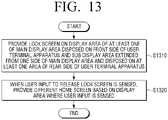 - While some of the authorities are restricted, theprocessor 120 may provide a lock screen with a high level of difficulty by the operation of turning over theuser terminal apparatus 100, the operation of touching one area of themain display area 10 and dragging the touched area in the upper direction of theuser terminal apparatus 100, or the operation of touching theGUI 910. In this case, theprocessor 120 may provide the lock screen with a high level of difficulty on themain display area 10.