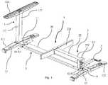 Das erste Beinelement 1 umfasst einen ersten Tragabschnitt 11 sowie einen ersten Fussabschnitt 12. Das zweite Beinelement 1 umfasst einen zweiten Tragabschnitt 21 sowie ein zweiten Fussabschnitt 22. Der erste Fussabschnitt 12 und der zweite Fussabschnitt 22 umfassen jeweils ein Vierkantrohr 122, 222 und einen Längsfuss 121, 122. Die Längsfüsse 121, 122 sind parallel zueinander und parallel zu den Längsabschnitten 31, 32 des Stützelements 3 ausgerichtet. Die Fussabschnitte 12, 22 sind an den jeweiligen Tragabschnitten 11, 21 mittels einer ersten Verstelleinrichtung 13 und einer zweiten Verstelleinrichtung 23 ein- und ausfahrbar gelagert.The