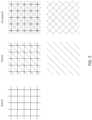 - Fig. 5 shows examples of a biaxial compliance control stitch pattern (upper left panel), a triaxial compliance control stitch pattern (upper center panel), and a quadaxial compliance control stitch pattern (upper right panel). In this example of a triaxial compliance control stitch pattern, a stitch pattern is sewn at a diagonal across a biaxial grid pattern. The lower center panel shows the diagonal stitch pattern (dotted lines). In this example of a quadaxial compliance control stitch pattern, two diagonal stitch patterns in opposing directions are sewn across a biaxial grid pattern. The lower right panel shows the opposing diagonal stitch patterns (dotted lines).