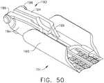 - As discussed above, excessive flexure of the anvil during the closure and firing processes can lead to the need for undesirably higher firing forces. Thus, stiffer anvil arrangements are generally desirable. Returning toFIGS. 20 and 21, another advantage that may be provided by theanvil 1130 andelongate channel 1102 depicted therein is that theanvil mounting portion 1150 of theanvil 1130 is generally more robust and therefor stiffer than other anvil and elongate channel arrangements.FIG. 50 illustrates use ofstiffener gussets 199 between theanvil mounting flanges 194 and the elongateanvil body portion 190. Similar gusset arrangements may also be employed between theanvil attachment flanges 1151 andanvil body 1132 ofanvil 1130 to further enhance anvil stiffness.