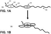 - FIG. 1 shows schematic representations of an exemplary scFv binding fusion protein with a single targeting moiety depicted in an N- to C-terminus orientation.FIG. 1A shows the configuration of a scFv binding fusion protein (100) with the single chain Fv targeting moiety in a "relaxed" conformation, comprising an N-terminal XTEN sequence (101), a VL binding domain sequence (102), a linker sequence (103), a VH binding domain sequence (104), and an XTEN carrier sequence (105) at the C-terminus.FIG. 1B shows the flexible linker permitting the two binding domains to come into association to form the antigen binding site of the scFv targeting moiety.