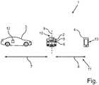 Die Schnittstellenvorrichtung 2, das Kraftfahrzeug 3 und die Einrichtung 4 sind insbesondere räumlich getrennt voneinander angeordnet. Zwischen dem Kraftfahrzeug 3 und der Schnittstellenvorrichtung 2 wird eine Kommunikationsverbindung 7 hergestellt. Zwischen der Einrichtung 4 und der Schnittstellenvorrichtung 2 wird eine Kommunikationsverbindung 8 hergestellt. Die jeweilige Kommunikationsverbindung 7, 8 kann beispielsweise eine drahtlose Verbindung, insbesondere als mobile Datenverbindung umfassen. Für die jeweilige Kommunikationsverbindung 7, 8 kann das IP (Internet Protocol) verwendet werden.The