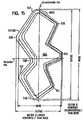 - Referring, for example, toFig. 4, it can be seen that, at ajunction point 540, for example, which is also shown inFig. 16, the high frequency loop is joined to the low frequency loop. This also occurs atjunction points 538 and 542. The additional thickness at these points restrains the ability of the loops to open up. On the other hand, loops extending fromcurved members 548 and 549 are not so restrained. The result is that the angle betweenmembers 513 and 516 opens up more than the angle betweenmembers 519 and 522, for example. The combined effect of these angles results in the increase in width of the high frequency section which compensates for the foreshortening of the low frequency section.