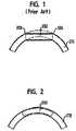 - To implant an expandable stent, it may be delivered to a desired site by a balloon catheter when the stent is in an unexpanded state. The balloon catheter is then inflated to expand the stent, affixing the stent into place. Due to the high inflation pressures of the balloon - up to 20 atm - the balloon causes thecurved vessel 204 and even a longitudinally flexible stent to straighten when it is inflated. If the stent, because of the configuration of its mesh is or becomes relatively rigid in the longitudinal axis after expansion, then the stent remains or tends to remain in the same or substantially the same shape after deflation of the balloon. However, the artery attempts to return to its natural curve (indicated by dashed lines) inFig. 1 with reference to a conventional mesh stent. The mismatch between the natural curve of the artery and the straightened section of the artery with a stent may cause points ofstress concentration 206 at the ends of the stent and stress along the entire stent length. The coronary vasculature can impose additional stress on stoats because the coronary vasculature moves relatively significant amounts with each heartbeat. For illustration purposes, the difference between the curve of the vessel and the straightened stent has been exaggerated inFig. 1.