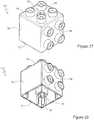 - Hence, in the examples ofFigure 16 to 20 thecubic brick 70, 80 comprises onefemale mating side 72 and onemale mating side 74. The remainingexternal sides 76 of the bricks, i.e. those which are neither male nor female mating sides, are plane sided. That is to say the remainingexternal sides 76 of the bricks are smooth and planar. Put another way, thebricks 70,80 comprise onefemale mating side 72, onemale mating side 74 and fourplanar sides 76.
