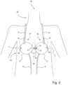 In einer weiteren bevorzugten Ausgestaltung der Behandlungsvorrichtung verlaufen die Strömungsräume wenigstens im Wesentlichen mäanderförmig, insbesondere jeweils von dem wenigstens ersten Teil der ersten oder der zweiten Manschette zu dem wenigstens zweiten Teil der ersten oder der zweiten Manschette.In a further preferred embodiment of the treatment device, the flow spaces run at least essentially in a meandering manner, in particular in each case from the at least first part of the first or second cuff to the at least second part of the first or second cuff.